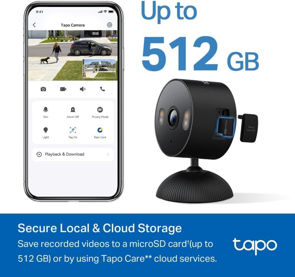 【No Subscription Storage Option】Store recordings on a microSD card at no cost (up to 512GB, sold separately) or subscribe to Tapo Care's cloud storage.