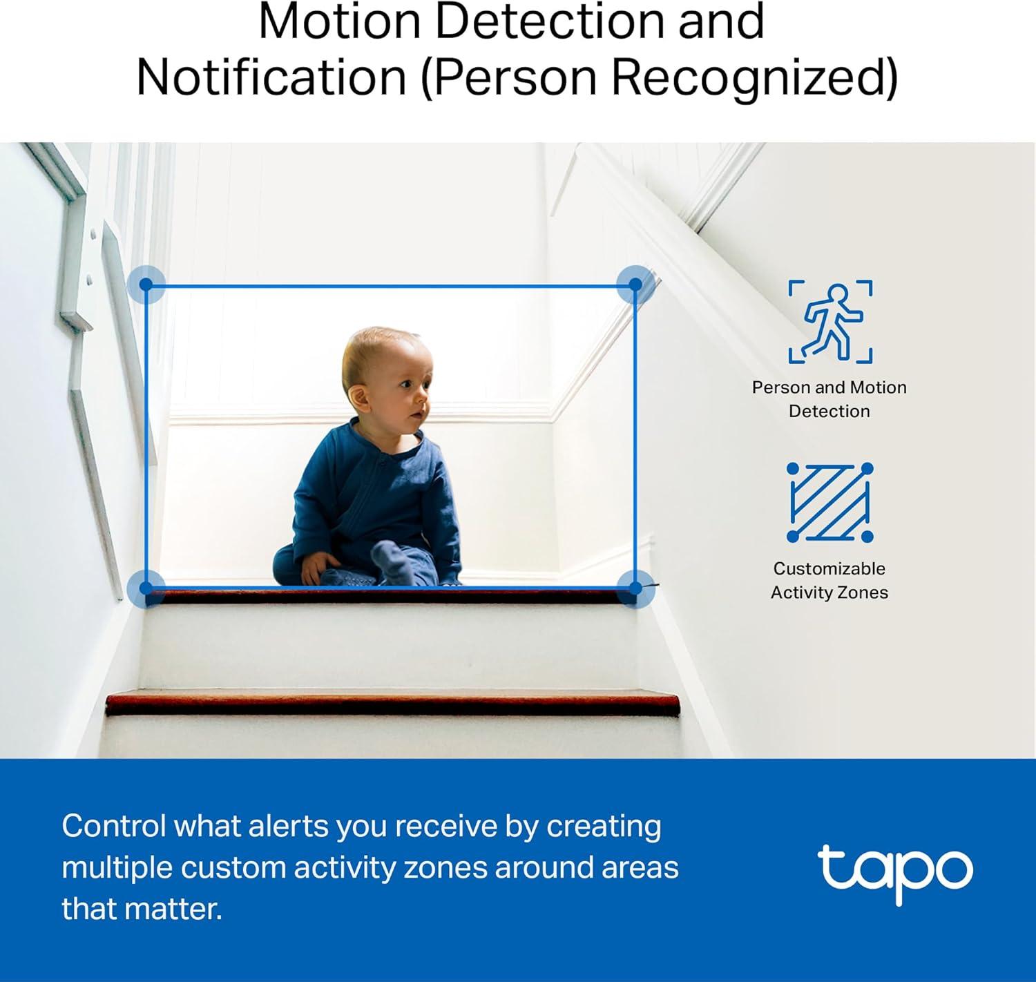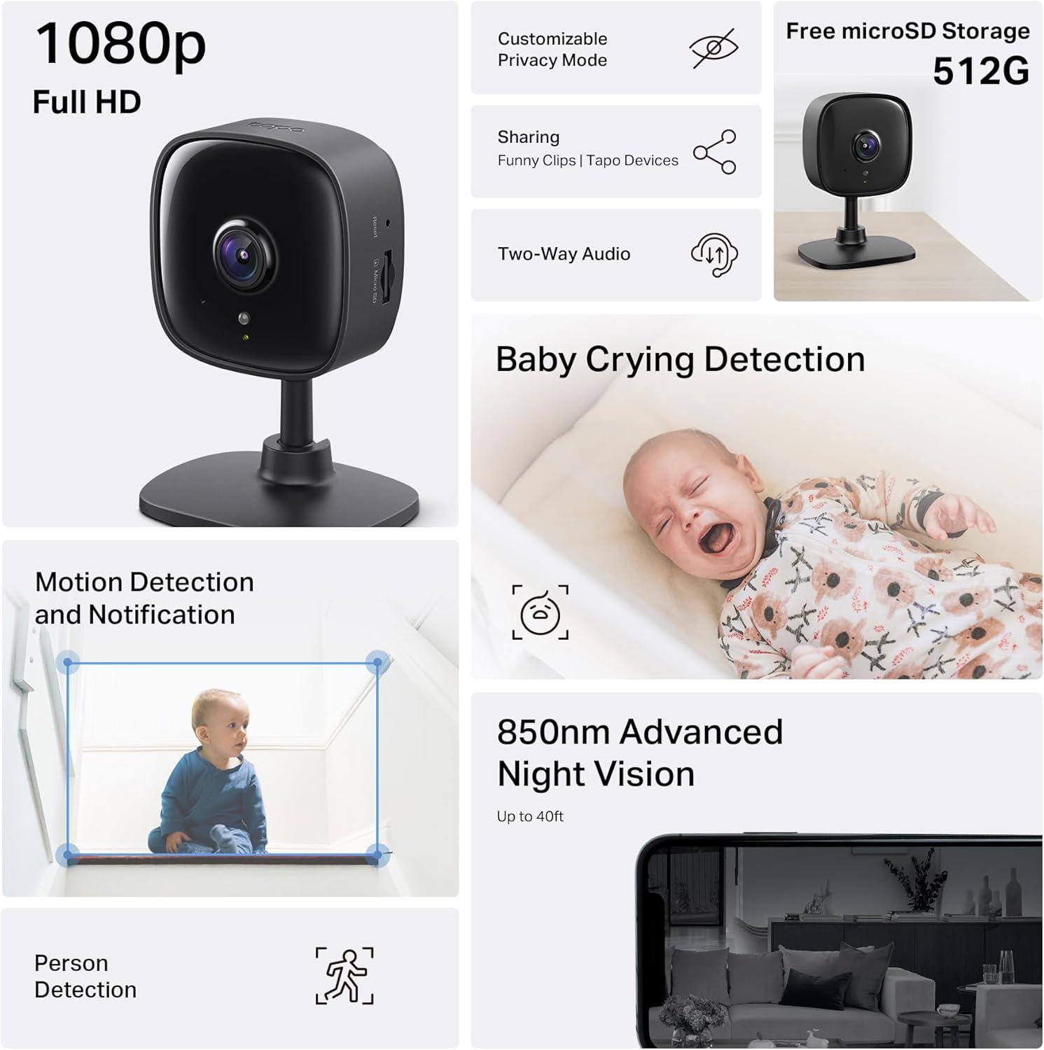 Protect your home with the Tapo C100 smart indoor security camera Wi-Fi. Featuring crystal-clear 1080P high-definition video, it captures every detail inside your home. Receive instant push notifications when motion, a person, or baby crying is detected from this baby camera monitor, all without additional fees. Monitor your home day and night with up to 40ft of night vision using the integrated IR sensor. Utilize the 2-way audio with a built-in siren to use as a pet camera with the phone app and deter intruders. Fully compatible with Amazon Alexa and Google Assistant, simply use voice commands to view the Tapo indoor security camera live stream on Echo Show or Google Chromecast with a screen. Store footage continuously on a microSD card up to 512 GB (not included) or subscribe to Tapo Care for cloud storage, offering a 30-day video history and additional benefits such as motion tracking and baby crying detection. [Before purchasing a microSD card, please check the TP-Link website FAQ to ensure compatibility with your device.]