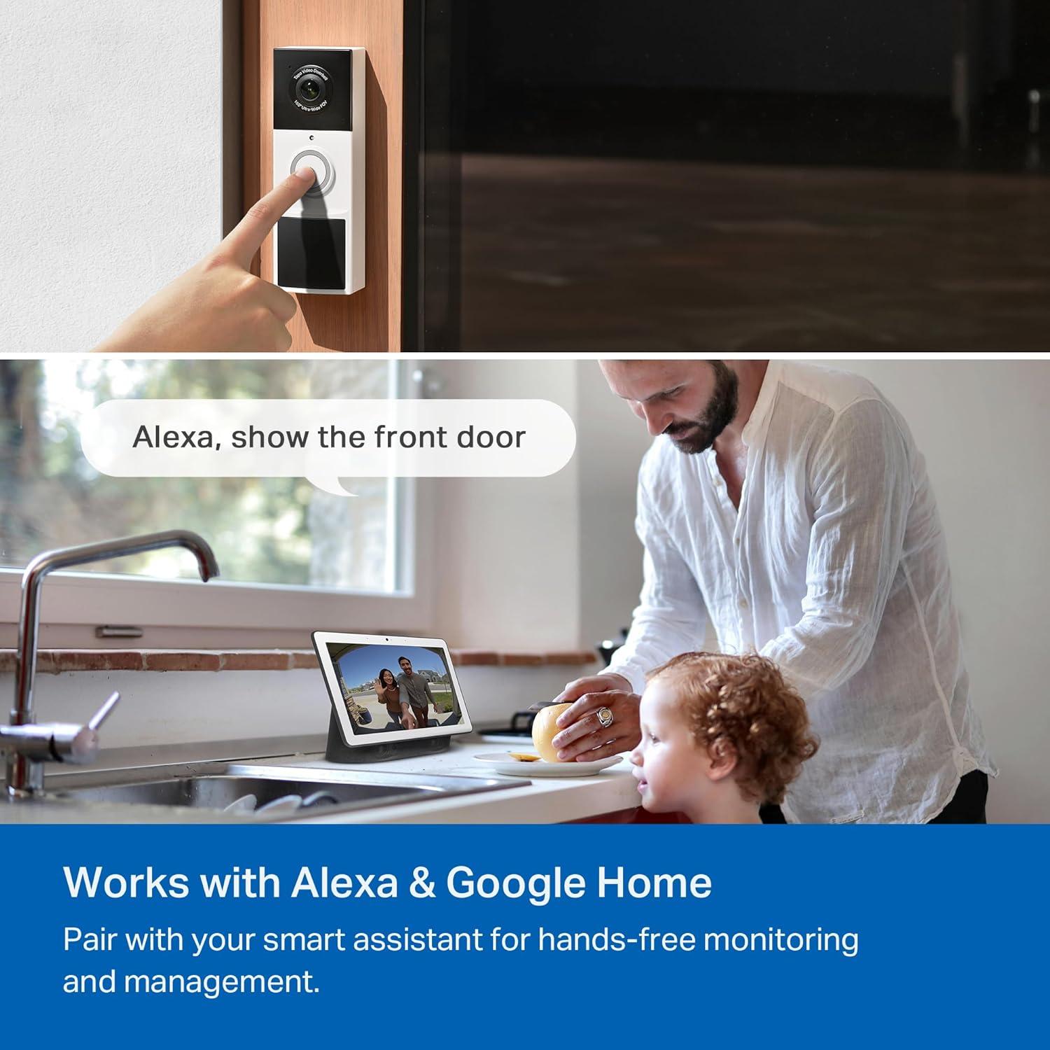 The Tapo D225 premium video doorbell elevates security and convenience to new heights. With this advanced doorbell camera, you can choose between up to 8 months of reliable battery operation or continuous monitoring via hardwiring, ensuring uninterrupted performance tailored to your needs. Enjoy unparalleled clarity with 2K QHD resolution, delivering stunningly detailed live views. The wireless doorbell offers a 180° head-to-toe angle view, capturing everything at your doorstep, while full-color night vision ensures no detail is missed, even in low light. The AI Detection system in this smart doorbell camera provides sophisticated person, package, and vehicle detection, delivering accurate and relevant alerts. Stay connected and communicate effortlessly with built-in two-way audio, allowing you to speak to visitors from anywhere. *𝗗𝗶𝘀𝗰𝗹𝗮𝗶𝗺𝗲𝗿𝘀: 1. microSD card sold separately. Actual storage capacity depends on the size of the microSD card used. 2. Cloud storage service available via Tapo Care subscription. 3. Compatible with Alexa and Google Assistant-supported displays. User experience varies based on connected services. 4. Chime is for indoor use only. 5. Battery life depends on recording time, live view usage, device settings, router specifications, and environmental factors.