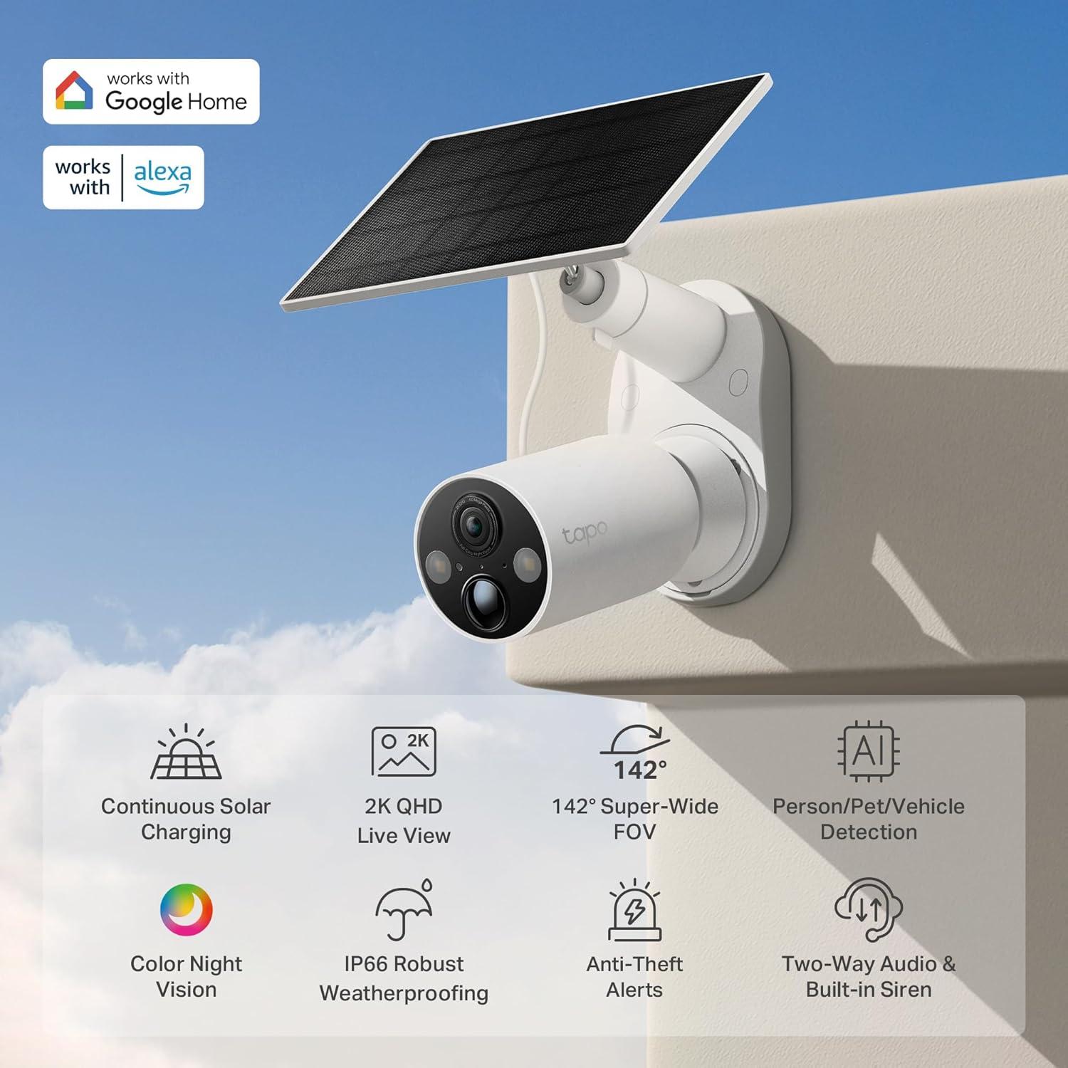 Enhance your home security with the Tapo SolarCam 2K, a versatile, solar-powered wireless outdoor camera system. Its innovative design allows for flexible setup, either as a unified unit or separately with a 13 ft cable. Enjoy continuous solar power, with just 45 minutes* of sunlight providing a full day’s charge and a 300-day* battery reserve for cloudy periods. Featuring Color Night Vision, 2K QHD Live View, with super-wide 150° FOV, and Free Person/Vehicle/Pet Detection, this camera ensures top-tier security with real-time alerts. Adaptable storage options include microSD card (up to 512GB)* and Tapo Care cloud service. Prioritize your privacy with encrypted video and two-factor authentication. The Tapo SolarCam 2K offers seamless, reliable security for both indoor and outdoor use. *𝗗𝗶𝘀𝗰𝗹𝗮𝗶𝗺𝗲𝗿𝘀: 1. 45 min of sunlight is based on standard environmental conditions (1000W/m2, 25°C, AM1.5) and specified working scenes (up to 100 events triggered per day). The actual required time of sunlight may vary. 2. 300-day battery life is based on Tapo laboratory tests with 250s of use per day. The time of use includes recording and watching live views. Actual battery life may vary due to device settings, usage, router specifications, and environmental factors. 3. MicroSD card purchased separately. Actual storage capacity depends on the size of the microSD card used. 4. Compatible with Alexa and Google Assistant supported displays. User experience is dependent on the connected device’s specifications. Streaming via Google limited to display on Chromecast & Nest devices only.