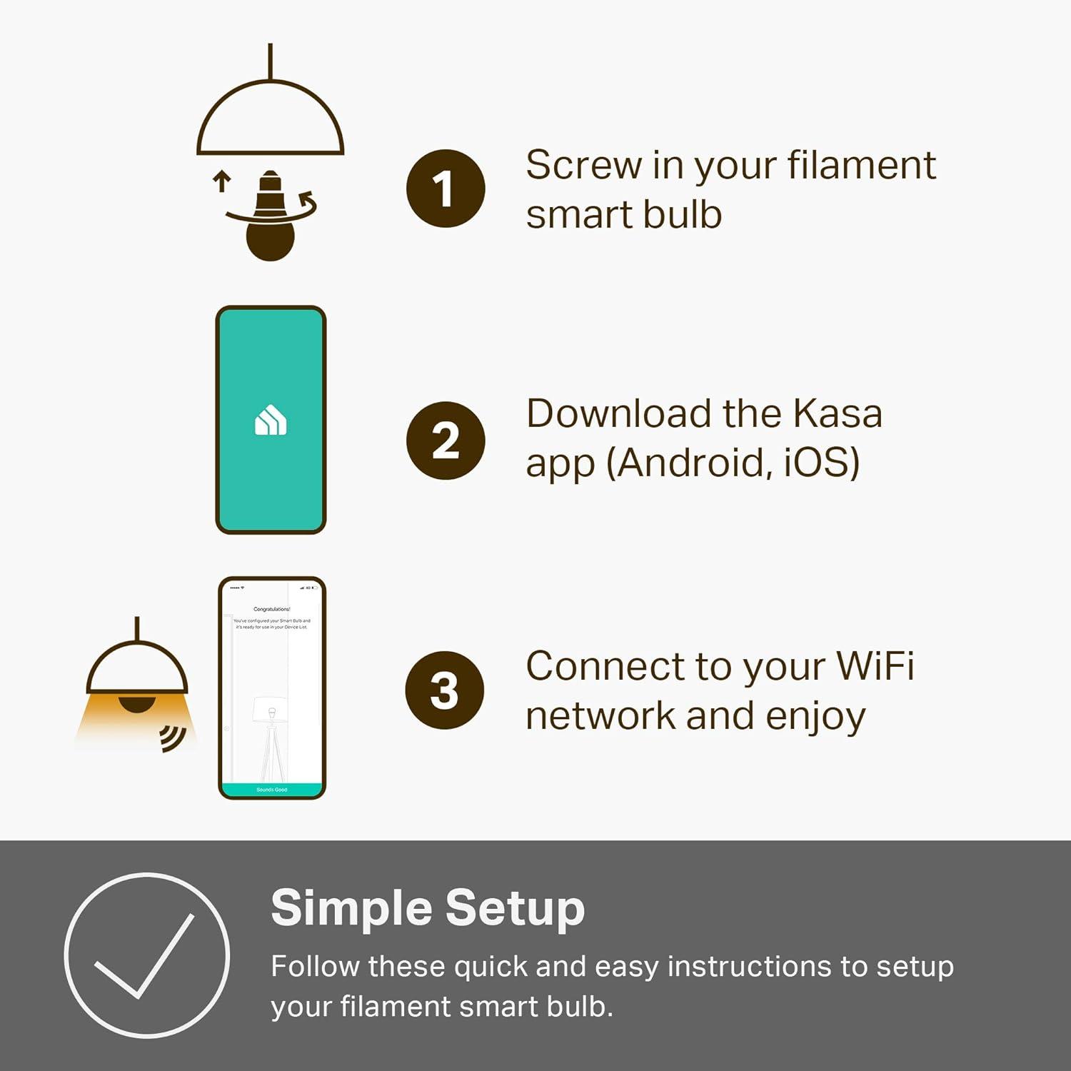 Simple Setup; Screw the bulb in, download the Kasa Smart app (Android, iOS), connect to Wi Fi, and watch your home light up